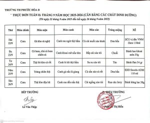 Thực đơn bán trú từ ngày 22/9 đến 26/9/2025